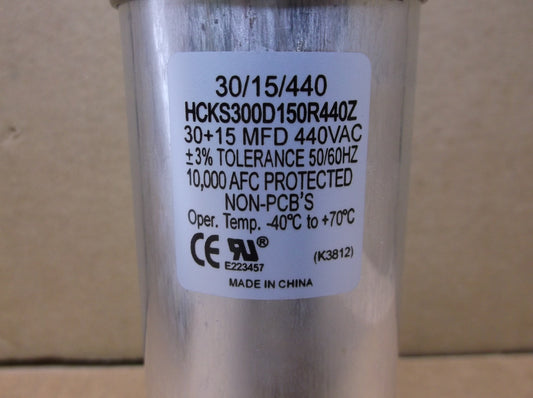 Condensador de funcionamiento doble redondo de 30+15 MFD x 440 V CA
