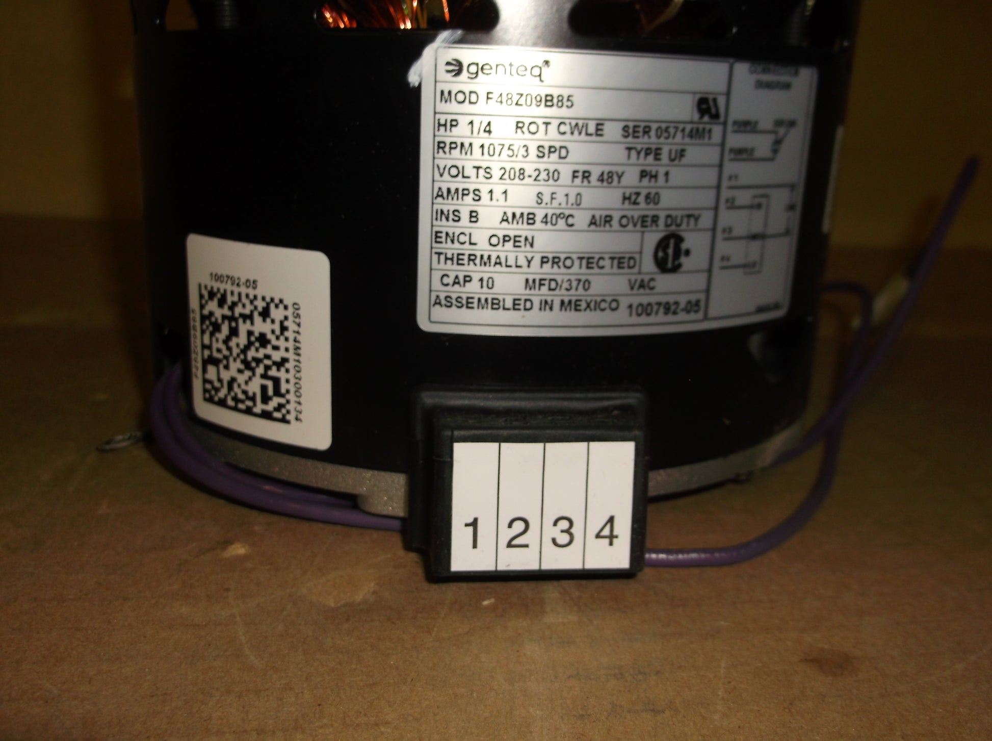 1/4Hp Blower Motor, Volts:208-230, Phase:1, Hertz:60, Amps:1.1, Frame:48Y, Type:Psc 10 X 370(Not Included)Mounting:Direct, Bearing:Sleeve, Body:Open, Rotation:Clockwise Lead End, Shaft:1/2" X 2-1/2", Dims Of Motor Body:4-1/4"H X 5-1/2"W, Weight:9.60 Pounds, (Made In Mexico) Mfg/Box,
