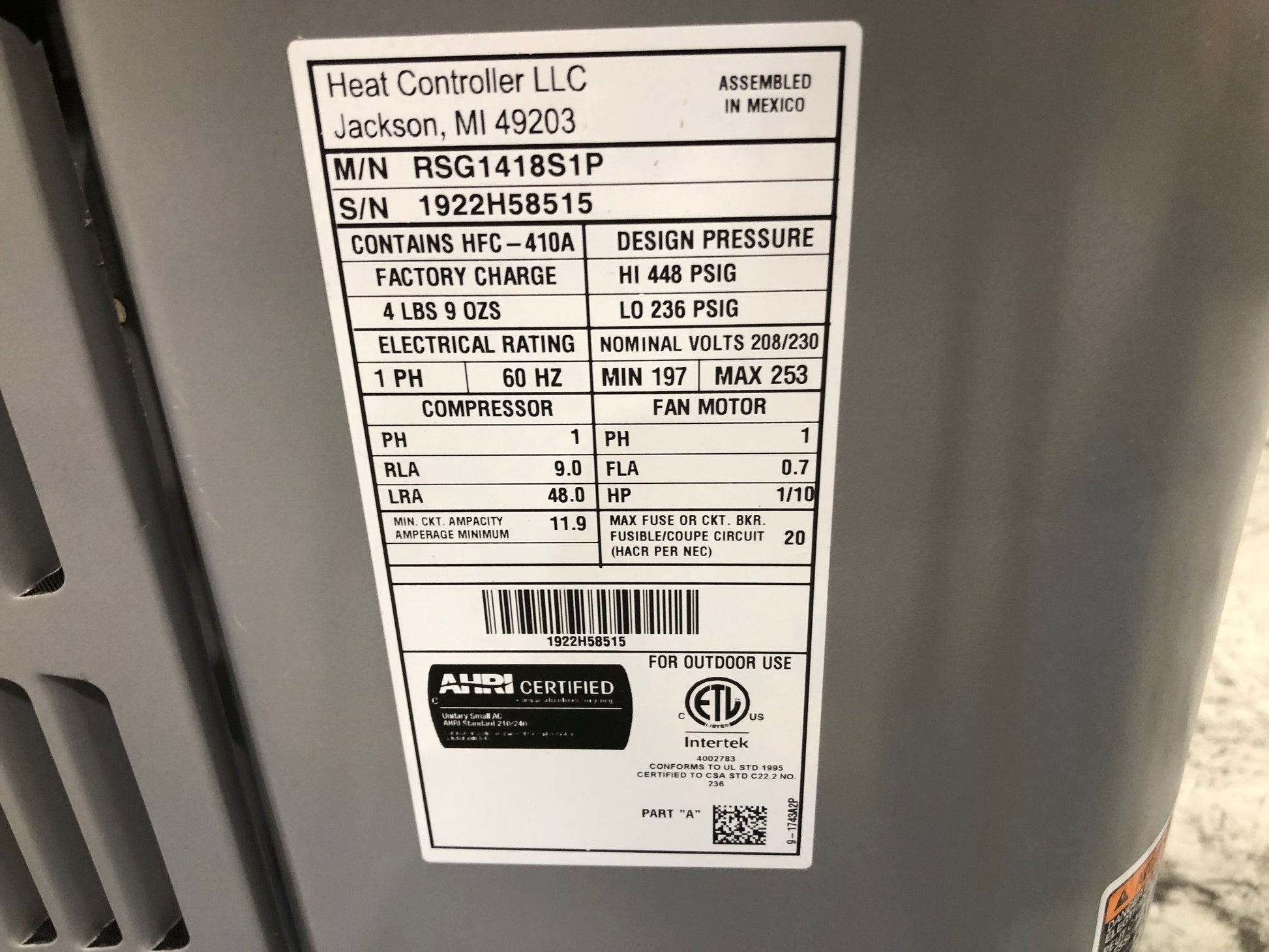 1.5 Ton Split System Air Conditioner, Volts:208-230, Hertz:60, Phase:1, Department Of Energy Guide Seer:14, Stage:1, Refrigerant:R-410A, Connection Size:3/8" X 3/4", Connection Type:Sweat, Factory Charge: 4Lbs 9Oz, Type: Air, Dimensions:29"H X 241/4"W X 241/4"D, Weight:150 Lbs, Made In Mexico **Factory Warranty Through 2029** **All Units Have Minor Cosmetic Damage**