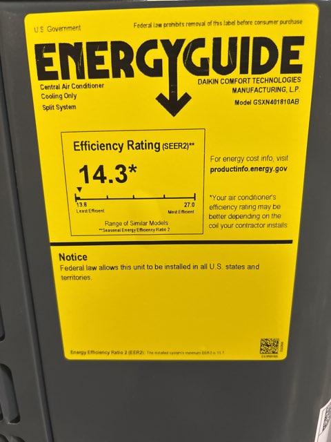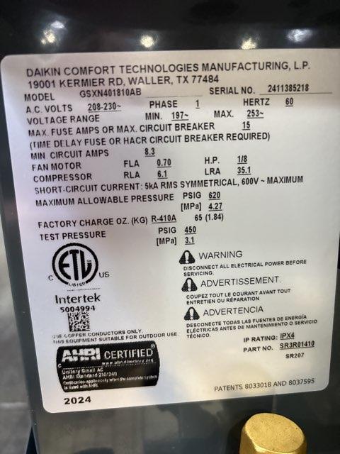1.5 Ton Split-System Air Conditioner, Circuit Voltage: 208-230, Hertz: 60, Phase: 1, Department Of Energy Guide Seer: 14.3, Stage: Single, Refrigerant: R410A, Connection Size: 3/8"X3/4", Connection Type: Sweat, Factory Charge: 4 Lbs 1 Oz, Dimensions: 27''H X 26''W X 26''D, Weight: 118 Lbs ***Unit includes a Manufacture Warranty, register your unit with the Manufacturer for details***