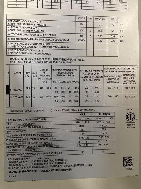 180,000, BTU Output: 145,800, Cooling BTU: 115,000, Heating BTU: 180,000, Overall Dims: 54-9/20''H X 93-3/4''W X 60-3/8''D, Weight: 1202 lbs