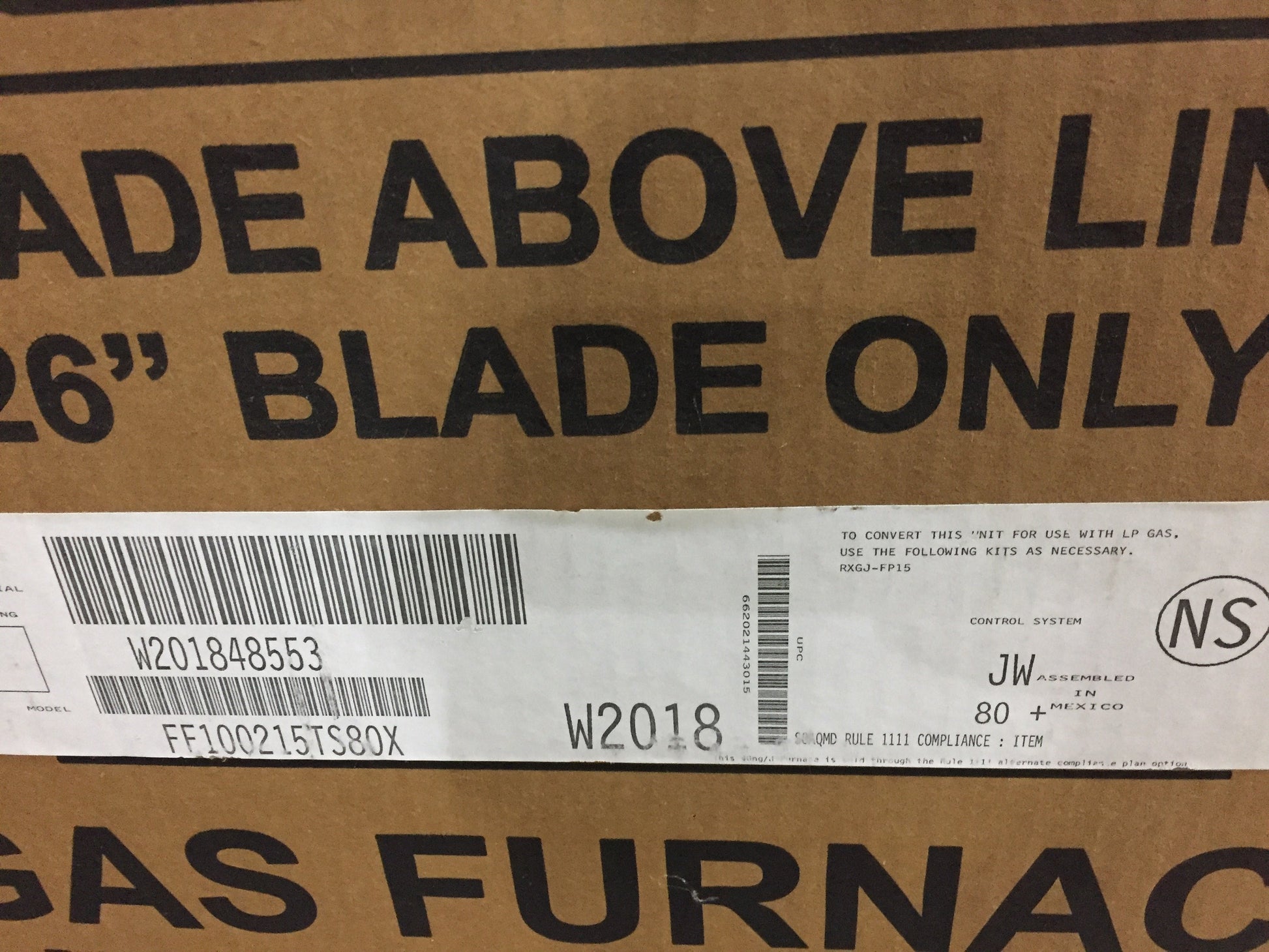 1840, Etapa: Única, Velocidad: Múltiple, Tipo de motor: ECM, Entrada BTU: 100,000, Salida BTU: 80,000, Dimensiones: 34" Alto X 21" Ancho X 29-19/32" Profundidad Kit de conversión de propano: RXGJ-FP15 (No incluido) ***La unidad incluye una garantía del fabricante, registre su unidad con el fabricante para obtener más detalles***