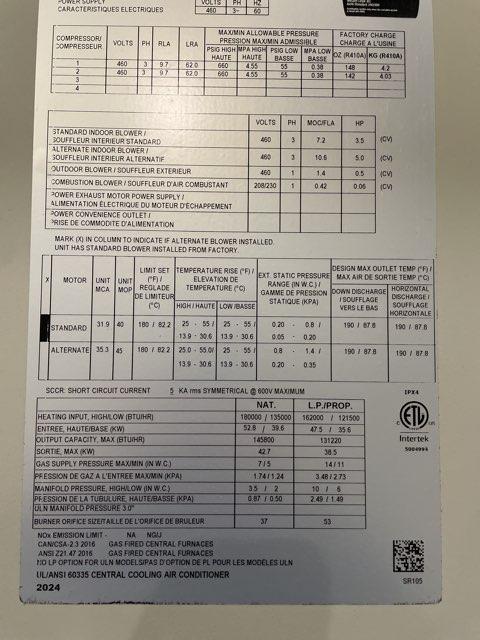 12.5 Ton Two Stage Convertible Natural Gas/Electric Packaged Unit, Volts: 460, Hertz: 60, Phase: 3, Refrigerant: R410A, Factory Charge: 148/142 oz Dual Circuit, EER: 11, CFM: 4892, BTU Input: