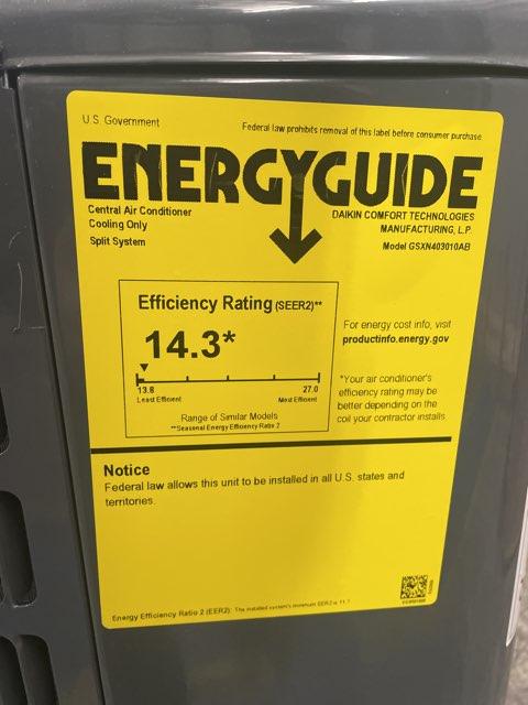 2.5 ton split-system air conditioner; Circuit Voltage: 208-230, Hertz: 60, Phase: 1, Department of Energy Guide SEER2: 14.3, Stage: single, Refrigerant: R410A, Connection Size: 3/8" x 7/8", Connection Type: sweat, Factory Charge: 4 lbs 15 oz, Dimensions: 39-1/2"H x 29"W x 29"D, Weight: 156 lbs
