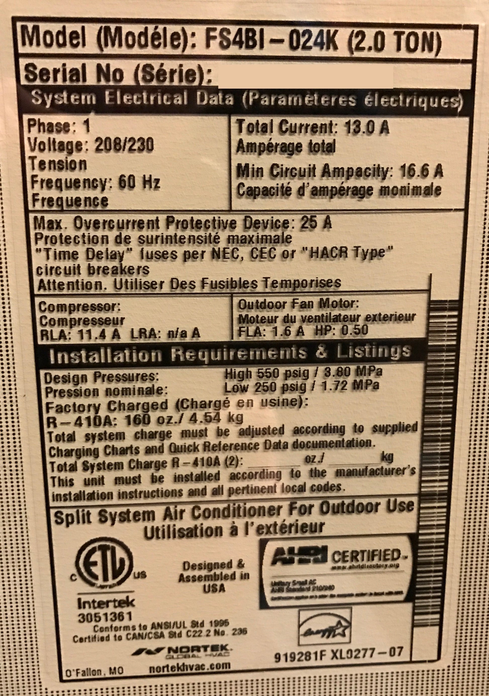Aire acondicionado de sistema dividido "Iq-Drive" de 2 toneladas, voltaje: 208/230, hercios: 60, fase: 1, SEER: 24,5, refrigerante: R-410A (cargado con 10 libras), presión de diseño alta/baja: 550/250 PSIG, tamaño de conexión: 3/8" X 3/4" de soldadura, tipo: fuente de aire, dimensiones: 37" de alto x 31-1/4" de ancho x 31-1/4" de profundidad, peso: 180 libras, en caja de fabricación, fabricado en EE. UU. (el producto incluye filtro secador). Compatible con unidades comunicantes Iq Drive