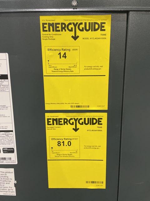 2 Ton Ultra Low NOx Single Stage Convertible Natural Gas/Electric Packaged Unit, Volts: 208-230, Hertz: 60, Phase: 1, Refrigerant: R410A, Factory Charge: 60 oz, EER: 11, Department of Energy Guide SEER (Range): 14, CFM: 1472, BTU Input: 55,000, BTU Output: 45,000, Cooling BTU: 23,600, Heating BTU: 55,000, Overall Dims: 35''H X 55-4/5''W X 47-21/50''D, Weight: 390 lbs **Ultra Low NOx Unit is not LP Compatible** *** No MFG Badge***