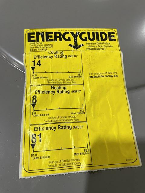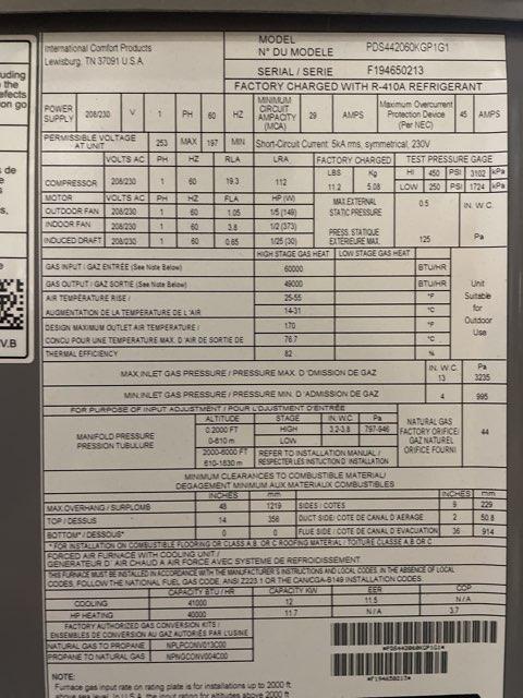 3.5 Ton Single Stage Low NOx ECM Variable Speed Dual Fuel Heat Pump Packaged Unit, Volts: 208-230 Volts: 208-230, 60, Phase: 1, Airflow: Convertible, CFM: 1400, SEER: 14.5, EER: 12, AFUE: 80.4%, Refrigerant: R410A, Factory Charge: 11.3 lbs, Metering Device: TXV, Heating BTU Input: 60,000, Heating BTU Output: 48,000, Unit Dims: 55''H X 48-3/16''W X 44-1/8''D, Weight: 472 lbs