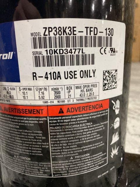 3 Ton AC Scroll Compressor, Volts: 308-460, Hertz: 50-60, Phase: 3, Capacity: 38,000 BTU, LRA: 46, Refrigerant: R410A, Oil Type: Polyolester, Connection Size: Liquid-1/2"; Gas-3/4", Connection Type: Sweat, Stage: Single, Height: 15-13/20'' H, Base Dims: 9-20/29'' W X 9-20/29'' D, Weight: 66 lbs