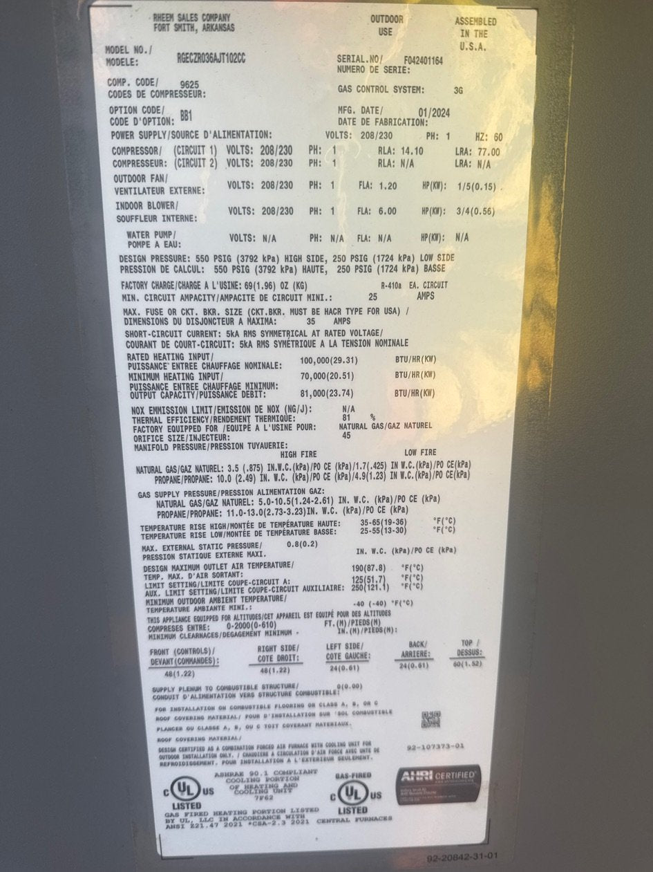 3 Ton Single Stage Convertible Natural Gas/Electric Packaged Unit, Volts: 208-230, Hertz: 60, Phase: 1, Refrigerant: R410A, Factory Charge: 69 oz, EER: 11.2, CFM: 1350, BTU Input: 100,000, BTU Output: 70,000, Cooling BTU: 36,000, Heating BTU: 100,000, Overall Dims: 41-3/8''H X 79-1/4''W X 46-3/4''D, Weight: 557 lbs