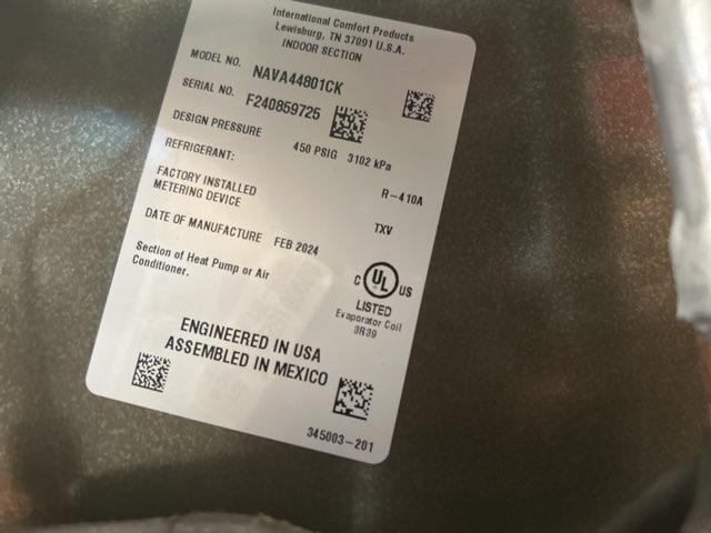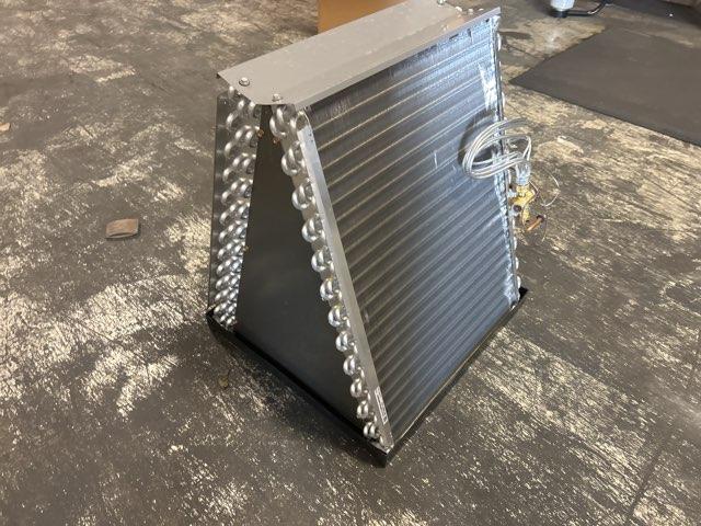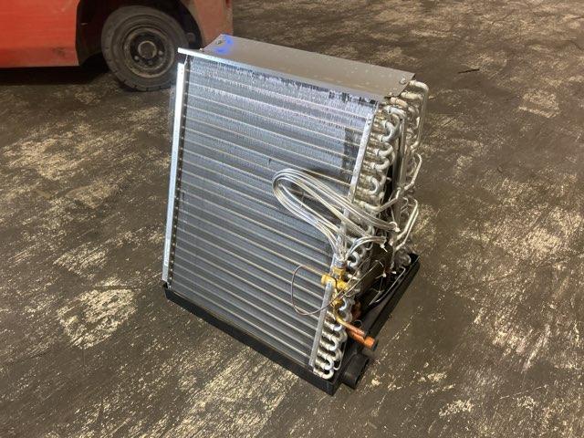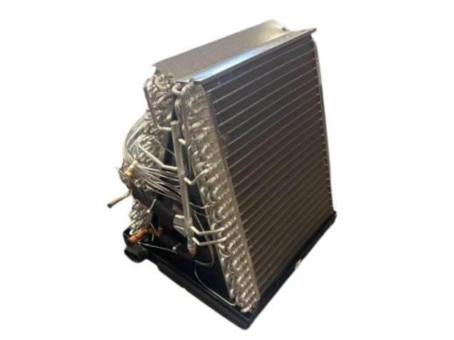 Serpentín flexible de aluminio revestido serie 'Cf' de 4 toneladas para aire acondicionado/HP, flujo de aire: ascendente/descendente, CFM: 1600, dispositivo de medición: ninguno, refrigerante: R-22, R-410A o R-407C, presión de diseño: 500 PSIG, presión de prueba de fábrica: 500 PSIG, tamaño de conexión: 3/8" x 7/8", tipo de conexión: soldada, bandejas de drenaje: plástico, dimensiones: 27" de alto x 24-1/2" de ancho x 21-1/2" de profundidad, peso: 65 libras, fabricado en EE. UU.