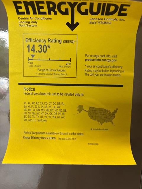 4 Ton Two Stage Split-System Communicating Compatible Air Conditioner, Circuit Voltage: 208-230, Hertz: 60, Phase: 1, Department of Energy Guide SEER2: 14.3, Stage: Two, Refrigerant: R410A, Connection Size: 3/8"X7/8", Connection Type: Sweat, Factory Charge: 15 lbs 1 oz, Type: Air, Dimensions: 46-1/2''H x 38-1/4''W x 34-1/2''D, Weight: 295 lbs **Compatible with York HxTM Thermostat or AE & AVC Series Air Handler**