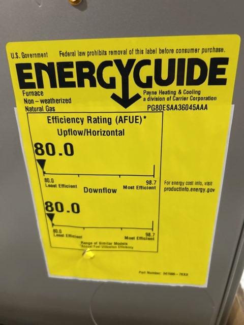 45,000 BTU Multiposition Natural Gas Furnace, Efficiency:80, Volts:115, Hertz:60, Phase:1, Cfm:780, Stage:1, Speed:Variable, Motor Type: Ecm, BTU Input: 45,000, BTU Output:36,000, Dimensions:33"H X 141/2"W X 29"D, Weight:104 Lbs,Made in USA, In Mfg Box, Propane Conversion Kit: Agagc8Pns01A (Not Included)