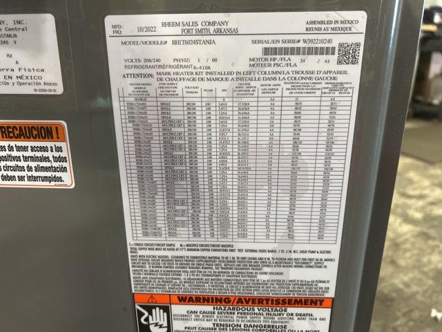 5 Ton AC/HP Air Handler, Airflow: Multiposition, Volts: 208-240, Hertz: 60, Phase: 1, CFM: 1800, Refrigerant: R-410A, Motor Type: ECM, Metering Device: TXV, Connection Size: Suction-7/8", Liquid-3/8", Type: Air Source, Dimensions: 55-1/2''H X 24-1/2''W X 21-11/16''D, Weight: 159 lbs ***Compatible Heat Kits: RXBH-1724 03-18 KW, RXBH-24A 20-30 KW (not included)***
