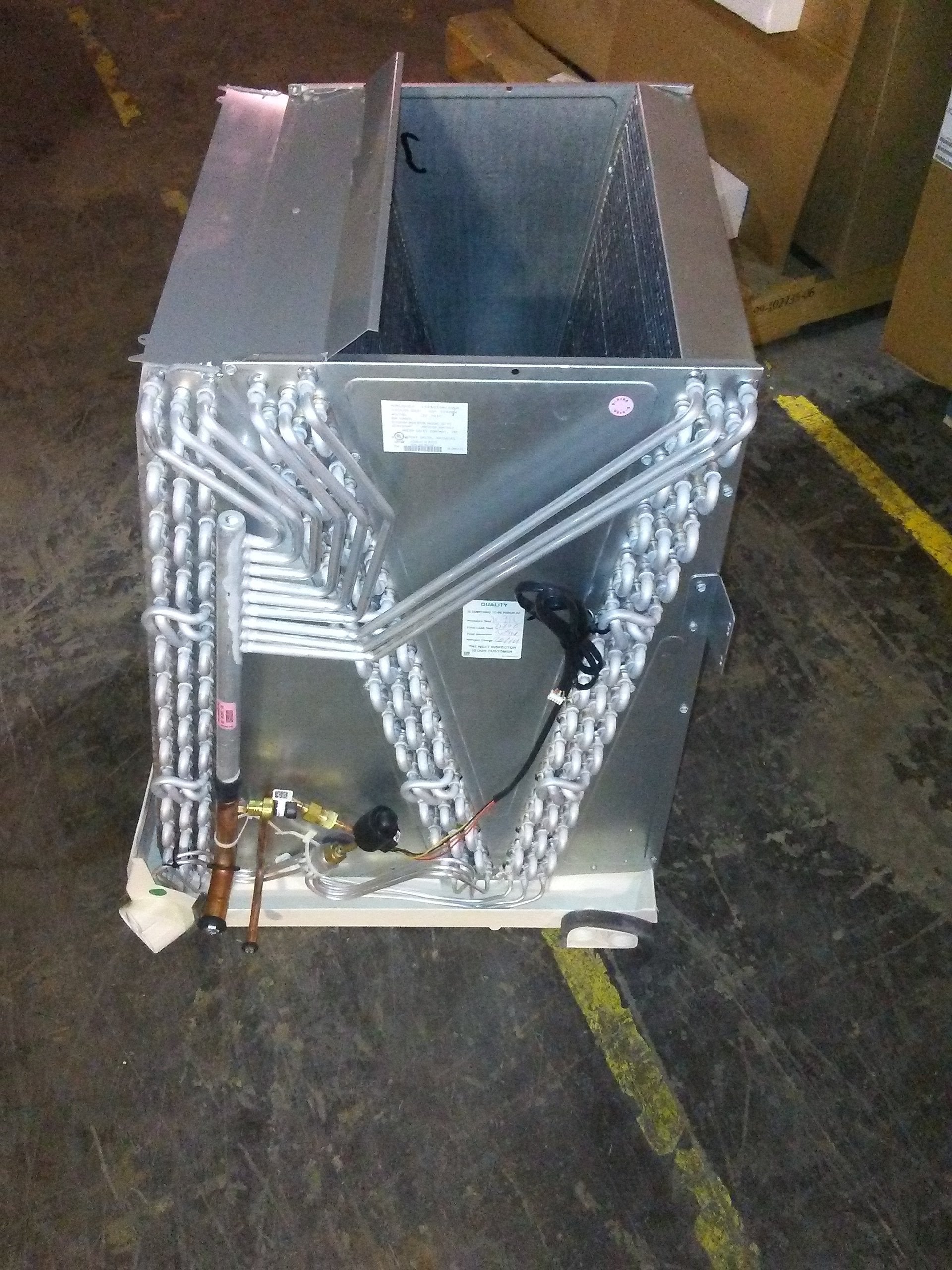 Serpentín "N" sin carcasa para aire acondicionado/HP de 5 toneladas, flujo de aire: ascendente, CFM: 1400-1600, medición: EEV, refrigerante: R-410A, tamaño de conexión: 3/8" x 7/8", tipo de conexión: soldada, bandeja de drenaje: plástico, dimensiones: 31" de alto x 24" de ancho x 21-3/4" de profundidad, peso: 65 libras, en caja de fabricación, hecho en México.