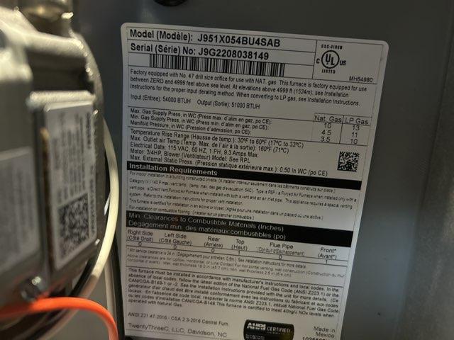1845, Stage: Single, Speed: Multi, Motor Type: ECM, BTU Input: 54,000, BTU Output: 51,000, Dimensions: 34-1/2''H X 17-1/2''W X 28''D, Weight: 95 lbs ***Propane Conversion Kit: 905028 (US), 905029 (Canada) (Not Included)***