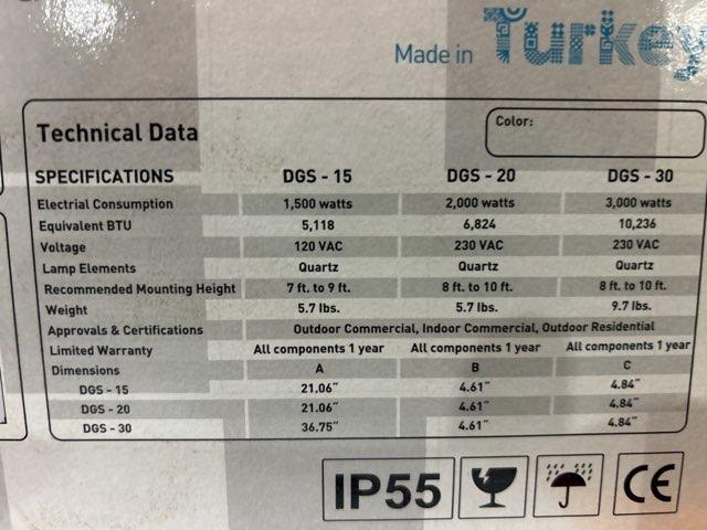 6,824 BTU Infrared Space Heater, Volts: 230V, Hertz: 50, Phase: 1, Amps: 8.7, Watts: 2000, Mounting Height: 7-9 ft, Lamp Qty: 1, Lamp Color: Gold-Filtered Red, Finish: Silver, Dimensions: 4-3/5''H X 21-3/50''W X 4-21/25''D, Weight: 5.7 lbs