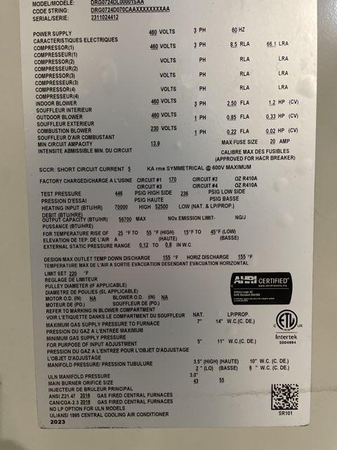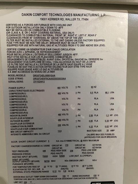 56,700, Cooling BTU: 72,000, Heating BTU: 70,000, Overall Dims: 53-3/4''H X 74''W X 48-5/16''D, Weight: 705 lbs
