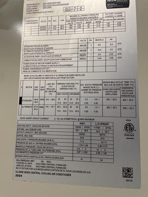 3, Refrigerant: R410A, Factory Charge: 155/155 oz Dual Circuit, EER: 12.2, CFM: 3655, BTU Input: