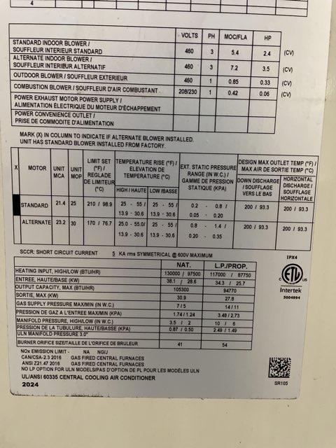 8.5 Ton Two Stage Convertible Natural Gas/Electric Packaged Unit, Volts: 460, Hertz: 60, Phase: 3, Refrigerant: R410A, Factory Charge: 155/155 oz Dual Circuit, EER: 12.2, CFM: 3655, BTU Input: