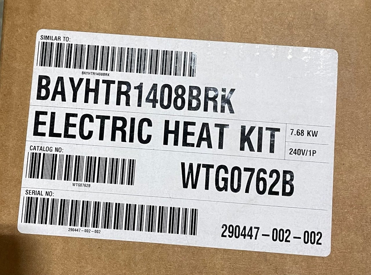 8 Kw Electric Heat Kit/W Breaker, Kw:7.68240 Volts, Volts:240, Hertz:60, Phase:1, Amps:32, Dims:6-1/2H X 14-1/2"W X 14"D, Weight:5 Lbs 10 Oz, In Mfg Box, Made in USA."