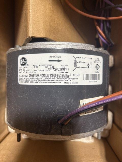 1/12 HP Condenser Fan Motor, Volts: 208-230, Hertz: 60, Phase: 1, Amps: 0.6, Rpm: 825, Rotation: Clock wise- Lead end, Totally Enclosed Air Over, Weight: 10 Lbs
