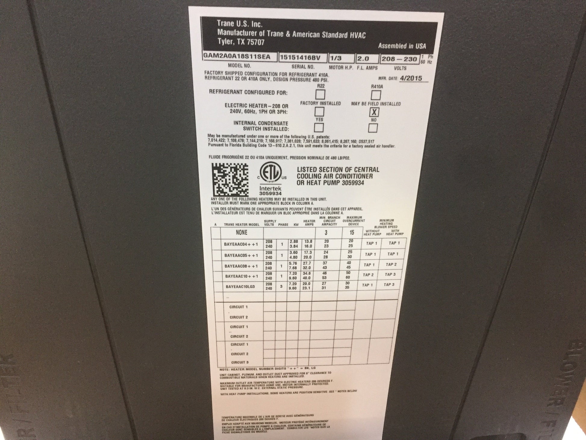 1.5 Ton Modular Multi Position PSC Fan Coil,Voltage-208-230/60/1,Refrigerant-R-410A (Can Be Converted To R-22 With Optional TXV Coversion Kit), CFM:225-1091, Air Flow-Multi-Position, Metering Device-TXV, Connections-3/4 X 3/8, Connection Type-Sweat, SEER Unknown, Heat-No Heat, Type-Air Source, Dimensions- H-50" W-17.5" L-22", Weight-113Lbs, In Mfg. Box, Assembled In USA Paired with: