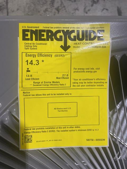 1.5 Ton Single Stage Split-System Air Conditioner, Circuit Voltage: 208-230, Hertz: 60, Phase: 1, Department of Energy Guide SEER: 14.3, Stage: Single, Refrigerant: R410A, Connection Size: