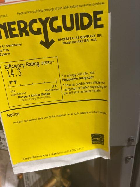 1.5 Ton Single Stage Split-System Air Conditioner, Circuit Voltage: 208-230, Hertz: 60, Phase: 1, Department of Energy Guide SEER2: 14.3, Stage: Single, Refrigerant: R410A, Connection Size: 3/8"X3/4", Connection Type: Sweat, Factory Charge: 94 oz, Type: Air, Dimensions: 25''H x 33-3/4''W x 33-3/4''D, Weight: 144 lbs