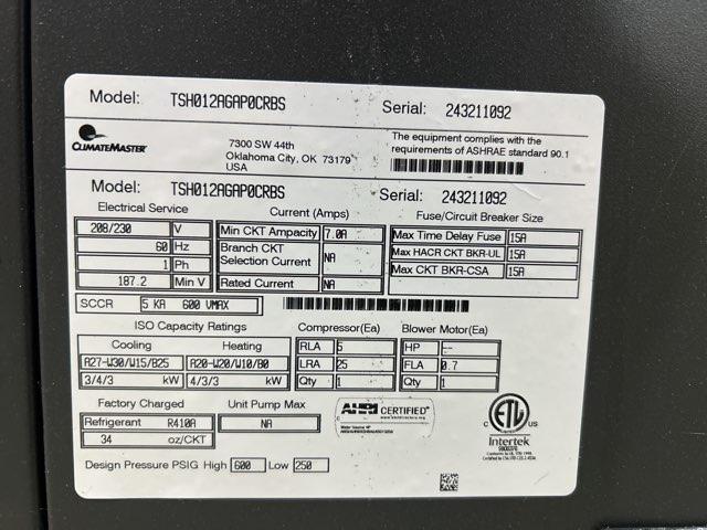 PSC, Refrigerant: R410A, Metering Device: TXV, Factory Charge: 34 oz, Water Loop - Cooling BTU: