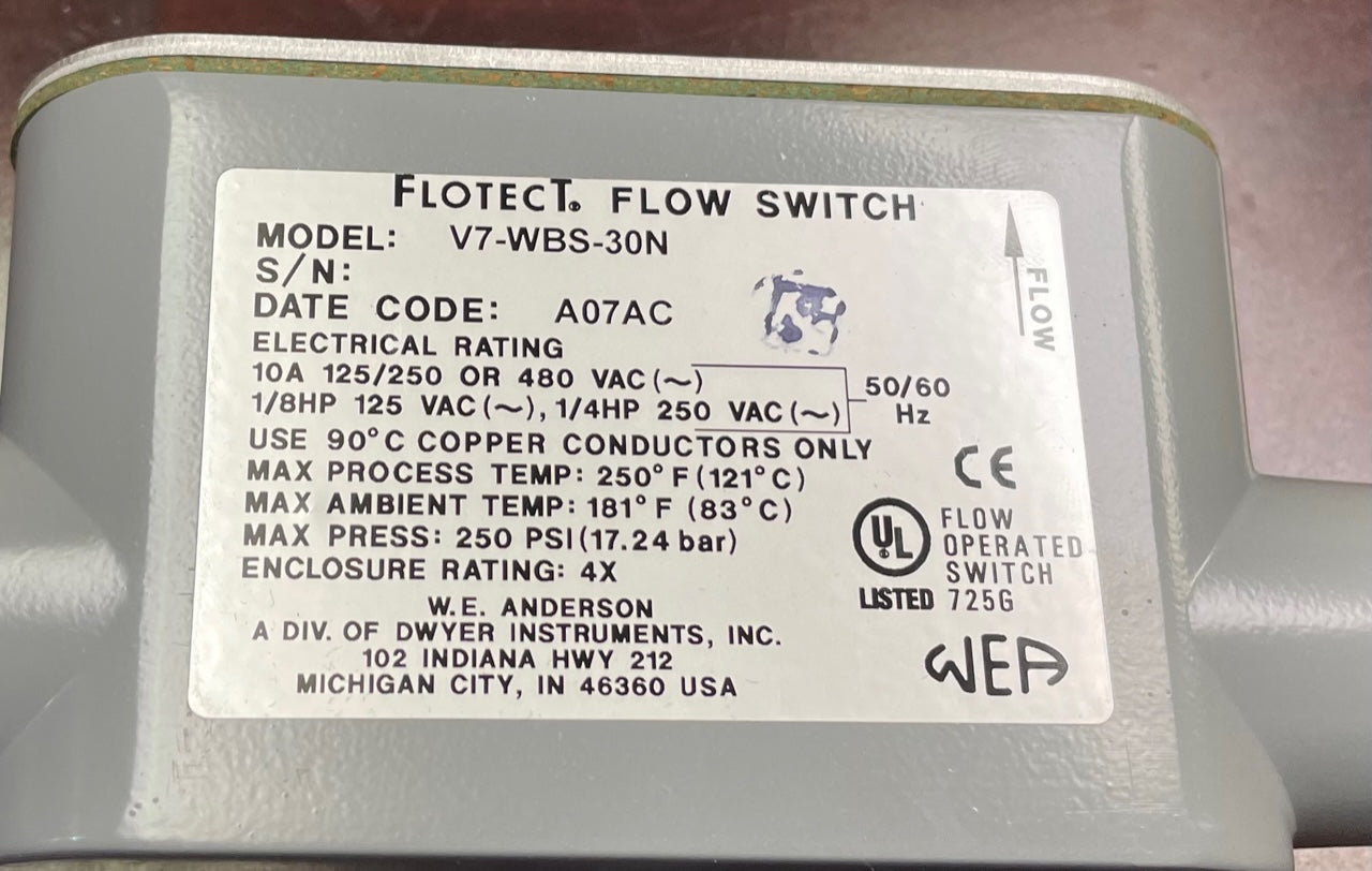 10 Amp Flow Switch, Volts:125-250/480, Hertz:60/50, Phase:1 or 3, Weight:2 Pounds, In Mfg Box, Made in USA.