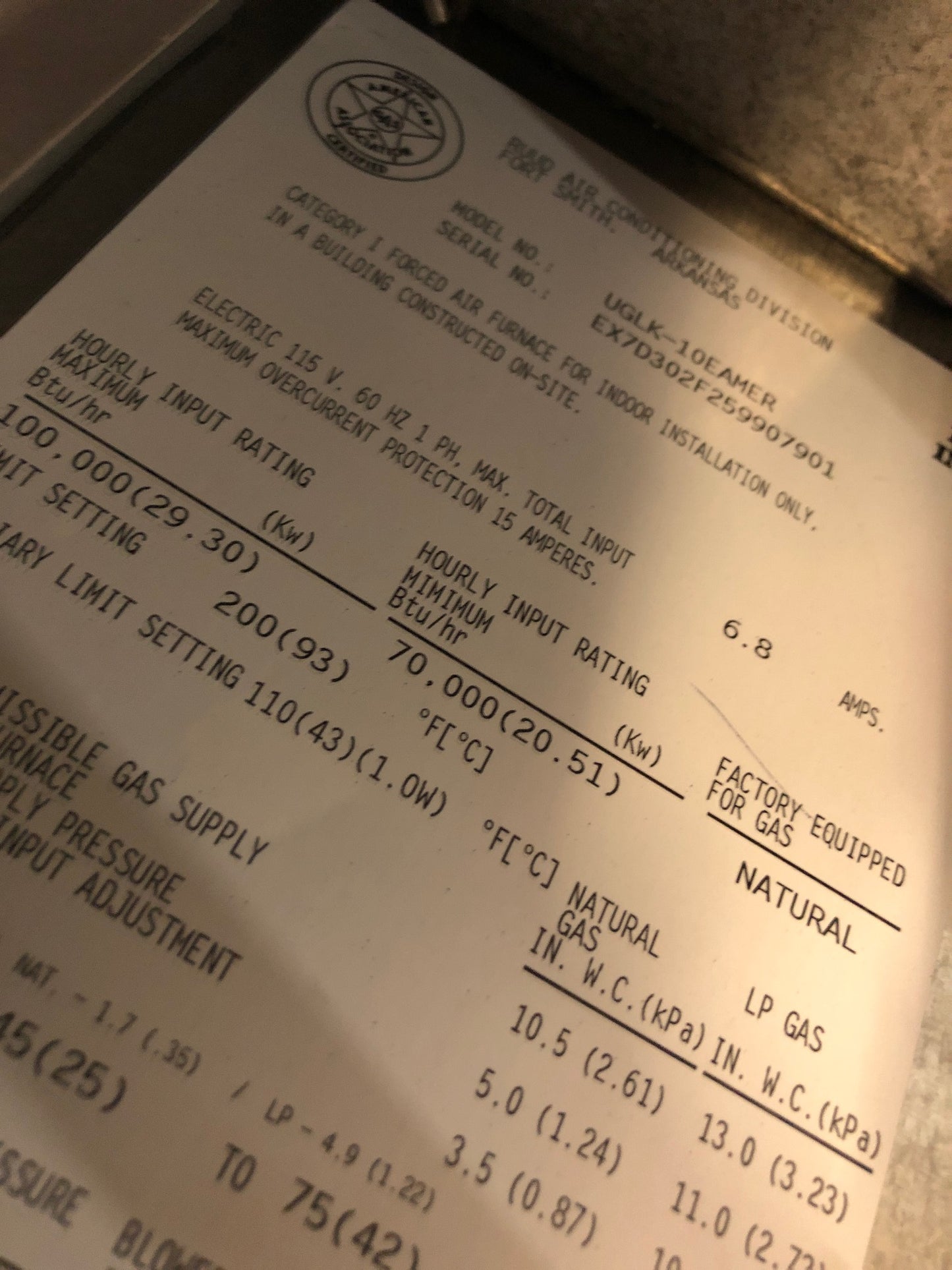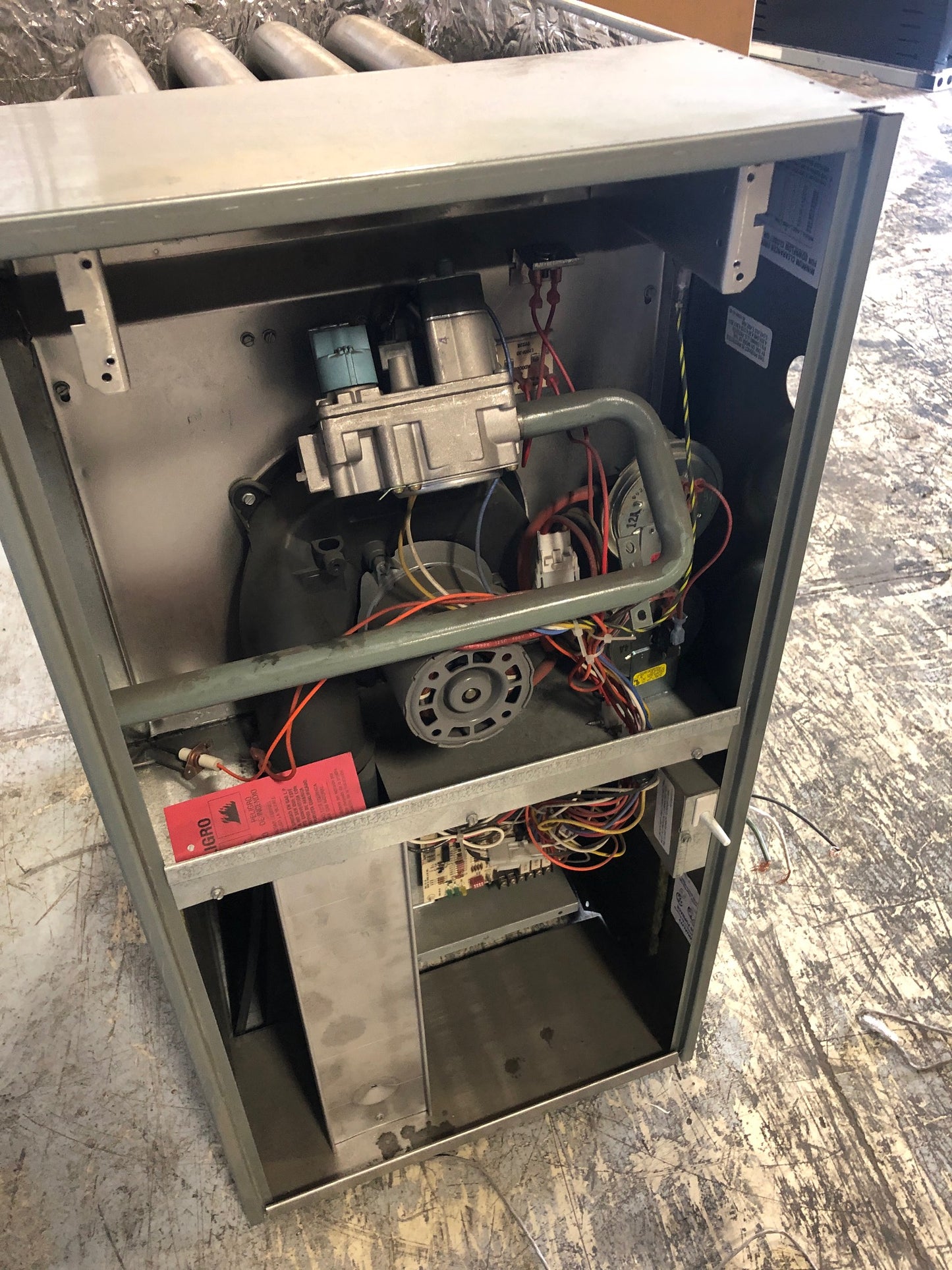 100,000 BTU Two-Stage Natural Gas Furnace, Volts:115, Hertz:60, Phase:1, Airflow:Downflow, CFM:2000, Efficiency:80, Gas Connection:1/2" N.P.T, Ignition:Direct Spark/W Remote Sensor, FLUE:3", 1st/2nd Stage Input BTU:100,000/90,000, 1st/2nd Stage Output BTU:81,000/72,500, Plenum Dims:16-3/4"W X 20-1/8"D, Overall Dims:34-3/4"H X 17-1/2"W X 28-5/8"D, Weight:120 Lbs, Origin:USA