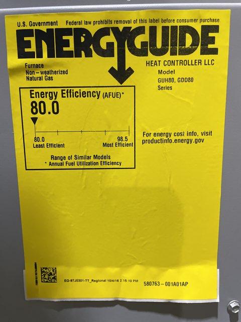 110,000 BTU Upflow/Horizontal Gas Furnace, Efficiency: 80%, Volts: 120, Hertz: 60, Phase: 1, CFM: 2420, Stage: Single, Speed: Multi, Motor Type: ECM, BTU Input: 110,000, BTU Output: 89,000, Dimensions: 33''H X 21''W X 28-3/8''D, Weight: 161 lbs ***Propane Conversion Kit: 11K50 (Not Included)***