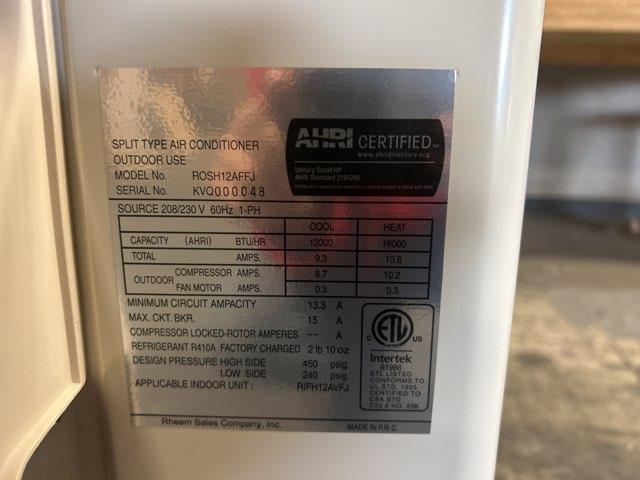 208/230, Hertz:60, Phase:1, Refrigerant: R-410A, Seer:22.7, Cooling/Heating Btu:12,000/16,000, Connection: 3/8" X 1/4", Connection Type: Flare, Dims: 24-7/16"H X 31-1/8"W X 12"D, Weight: 86 Lbs, In Mfg Box, Made In Prc. **For Use With Indoor Unit Rifh12Avfj (Not Included)** **Unit includes a Manufacture Warranty, register your unit with the Manufacturer for details**