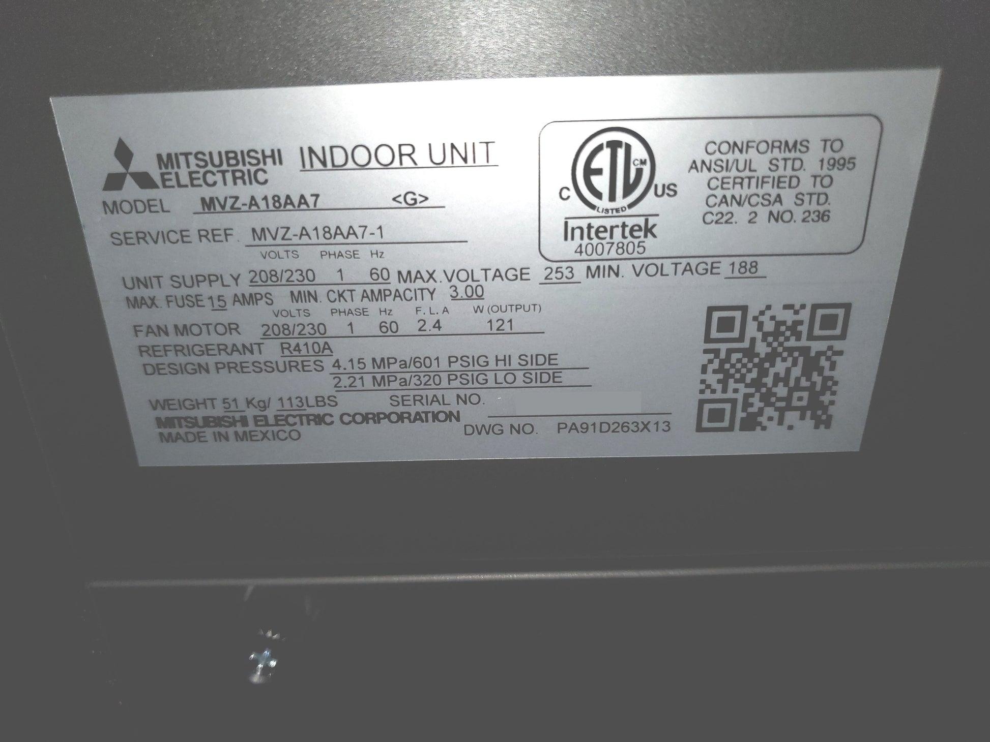 18,000 BTU Ducted Multi-Position ECM Motor Heat Pump Air Handler, Voltage: 208/230, Hertz: 60, Phase: 1, SEER:, Refrigerant: R-410A, Connection Type: Flare, Connection Size: 1/4" X 1/2", Rated Cooling Capacity:18,000 BTU/H, Rated Heating Capacity: 20,000 BTU/H, Dims: 50-1/4"H X 17"W X 21-5/8"D, Weight: 113 Lbs, Made In Mexico, For Use With MXZ-Multi-Zone Outdoor Heat Pump Unit (Not Included)