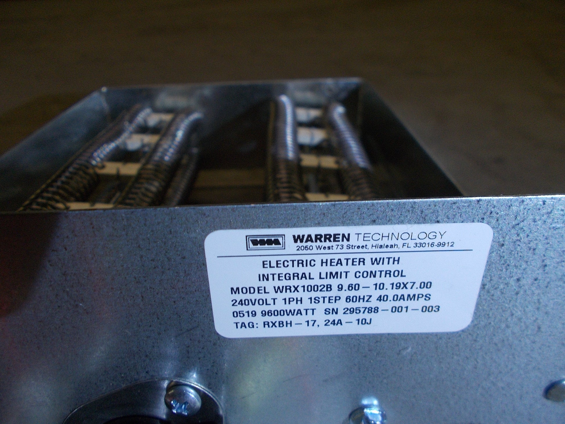 10 KW electric heat kit; Volts: 240, Hertz: 60, Phase: 1, Amps: 40, *includes one 60amp breaker*, Dims: 5-1/4"H x 11"W x 21-1/2"L, Weight: 5 lbs, in mfg box, made in USA