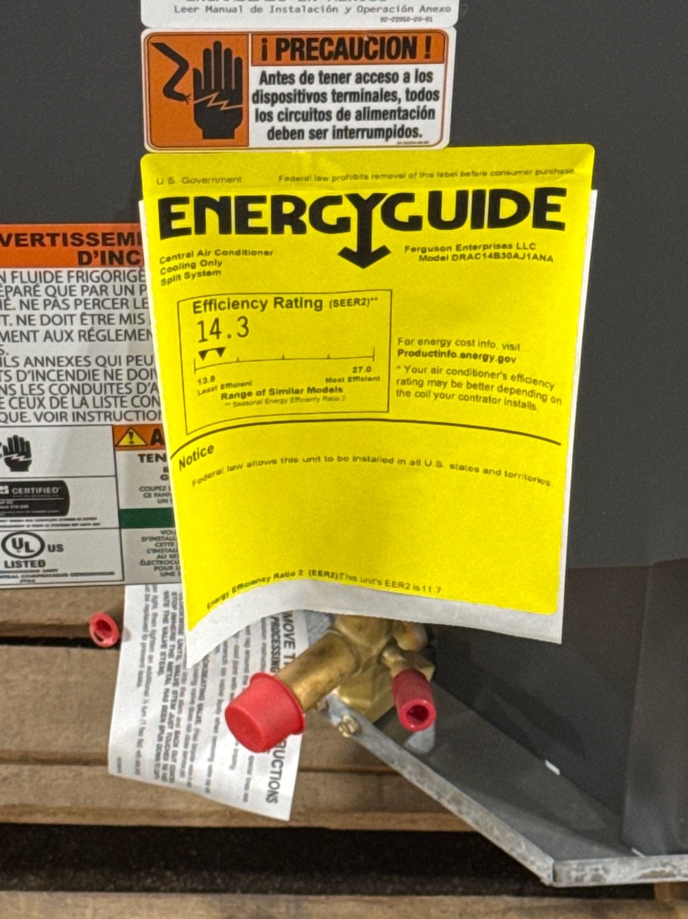 2.5 Ton Single Stage Split-System Air Conditioner, Circuit Voltage: 208-230, Hertz: 60, Phase: 1, Department of Energy Guide SEER2: 14.3, EER2: 11.7, Stage: Single, Refrigerant: R454B, Connection Size: 3/8"X3/4", Connection Type: Sweat, Factory Charge: 112 oz, Type: Air, Dimensions: 25-8/47''H x 33-33/50''W x 33-33/50''D, Weight: 151 lbs