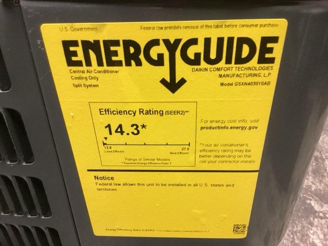 2.5 ton split-system air conditioner; Circuit Voltage: 208-230, Hertz: 60, Phase: 1, Department of Energy Guide SEER2: 14.3, Stage: single, Refrigerant: R410A, Connection Size: 3/8" x 7/8", Connection Type: sweat, Factory Charge: 4 lbs 15 oz, Dimensions: 39-1/2"H x 29"W x 29"D, Weight: 156 lbs **Minor damage on bottom right side**