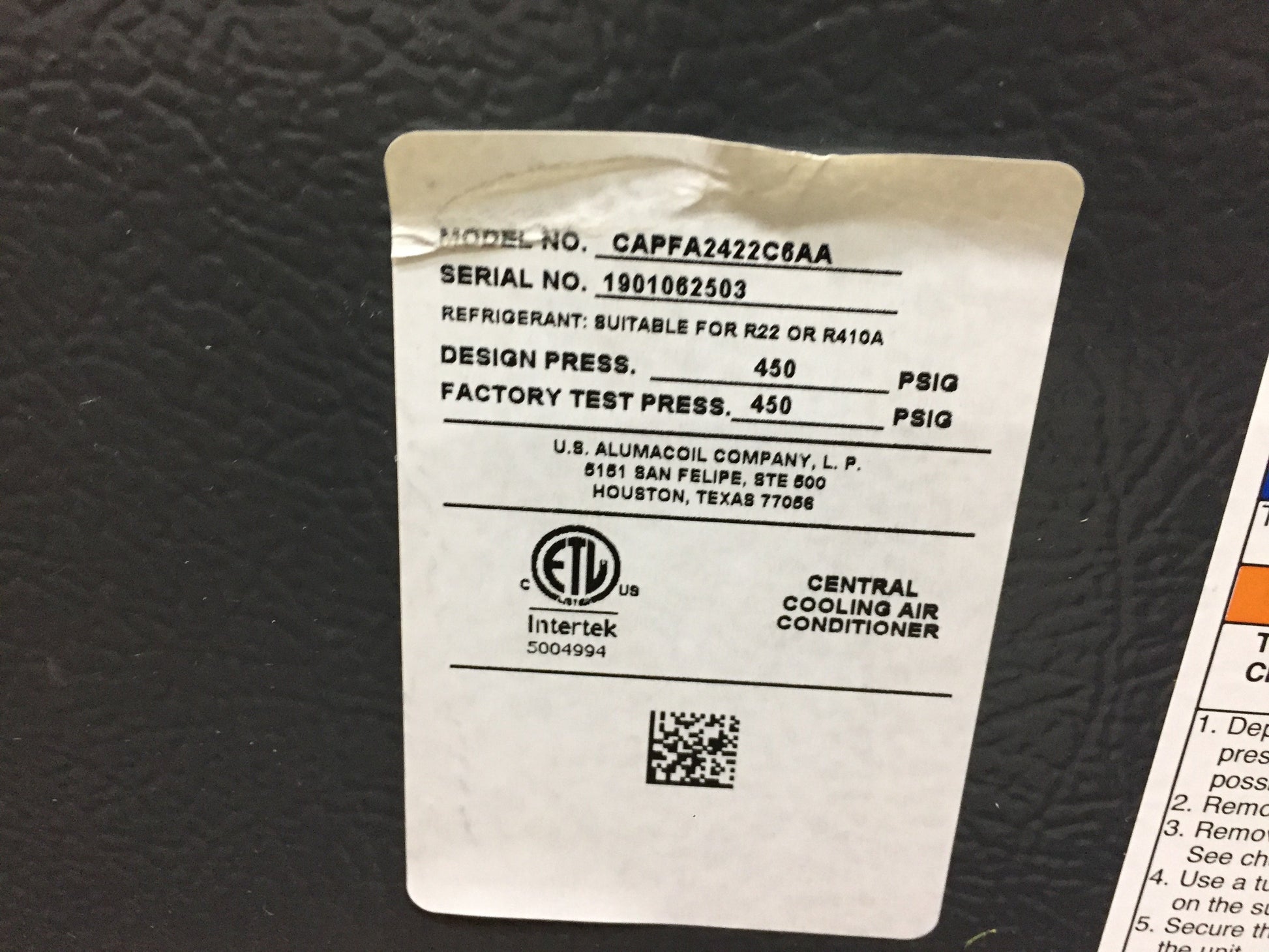 2 ton cased 'A' coil; Airflow: upflow/downflow, CFM: 1500, Metering Device: flowrator, Connection Type: sweat, Refrigerant: R-22 / R-410A, Connection Size: 3/8" x 3/4", Drain Pan: thermoplastic, Dimensions: 22"H x 21"W x 21"D Paired with: