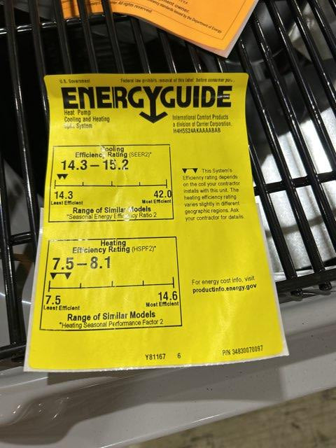 2 ton single stage split-system heat pump; Circuit Voltage: 208-230, Hertz: 60, Phase: 1, Department of Energy Guide SEER2: 14.3, EER2: 11, Stage: single, Refrigerant: R410A, Connection Size: 3/8" x 5/8", Connection Type: sweat, Factory Charge: 6.3 lbs, Type: air, Dimensions: 32-1/8"H x 31-3/16"W x 31-3/16"D, Weight: 172 lbs