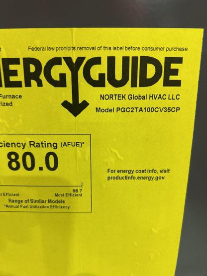100,000 BTU Low NOx Upflow/Horizontal Gas Furnace, Efficiency: 80%, Volts: 115, Hertz: 60, Phase: 1, CFM: 2280, Stage: Two, Speed: Variable, Motor Type: ECM, BTU Input: 100,000, BTU Output: 80,000, Dimensions: 34-1/2''H X 21''W X 28''D ***Propane Conversion Kit: 904914 (Not Included)***