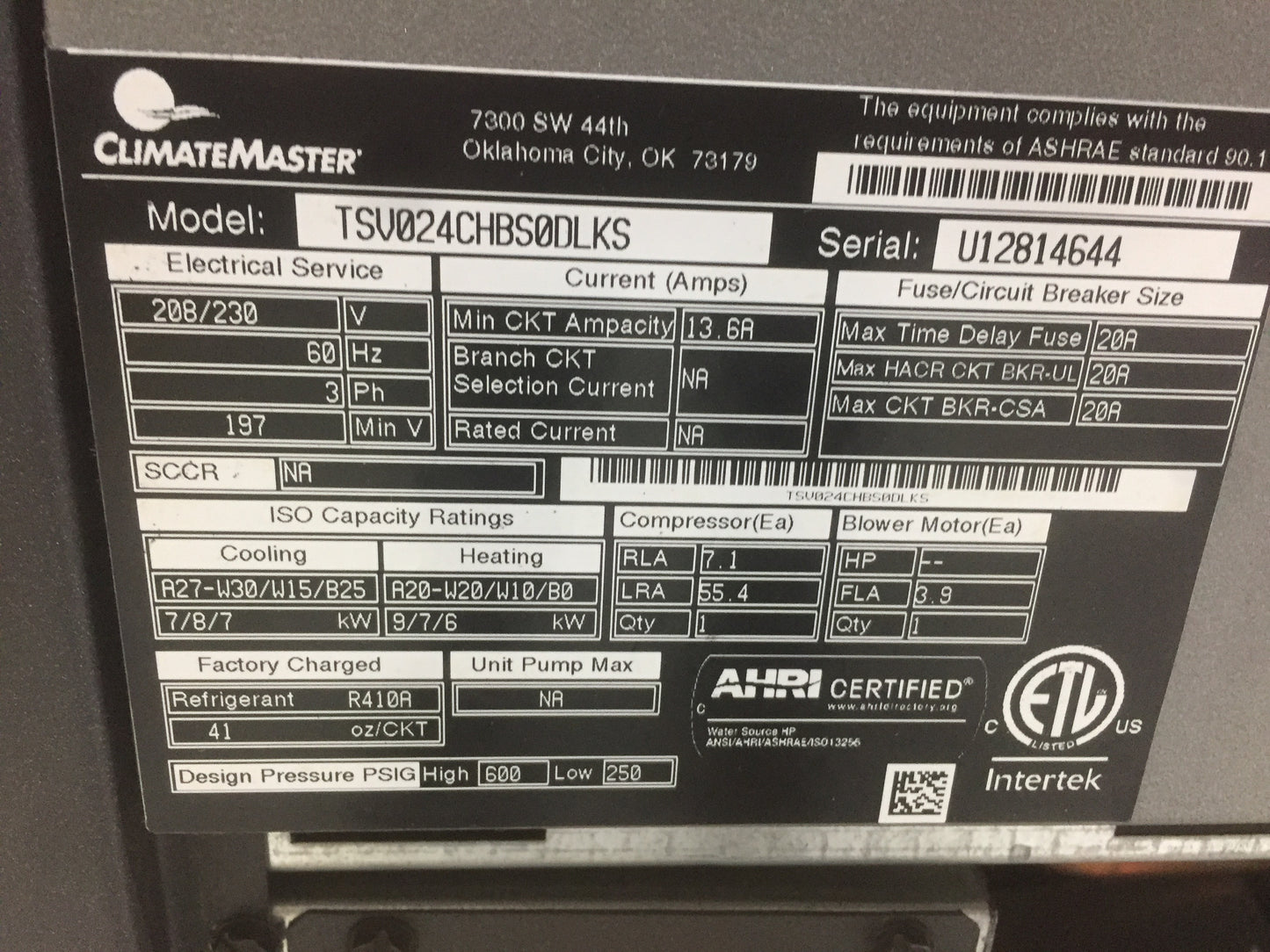 R-410A, Water Connection Size: 3/4", Connection Type: Flare, Dimensions: H-49", W-25", L-26", Weight: 266 Lbs, Made in USA