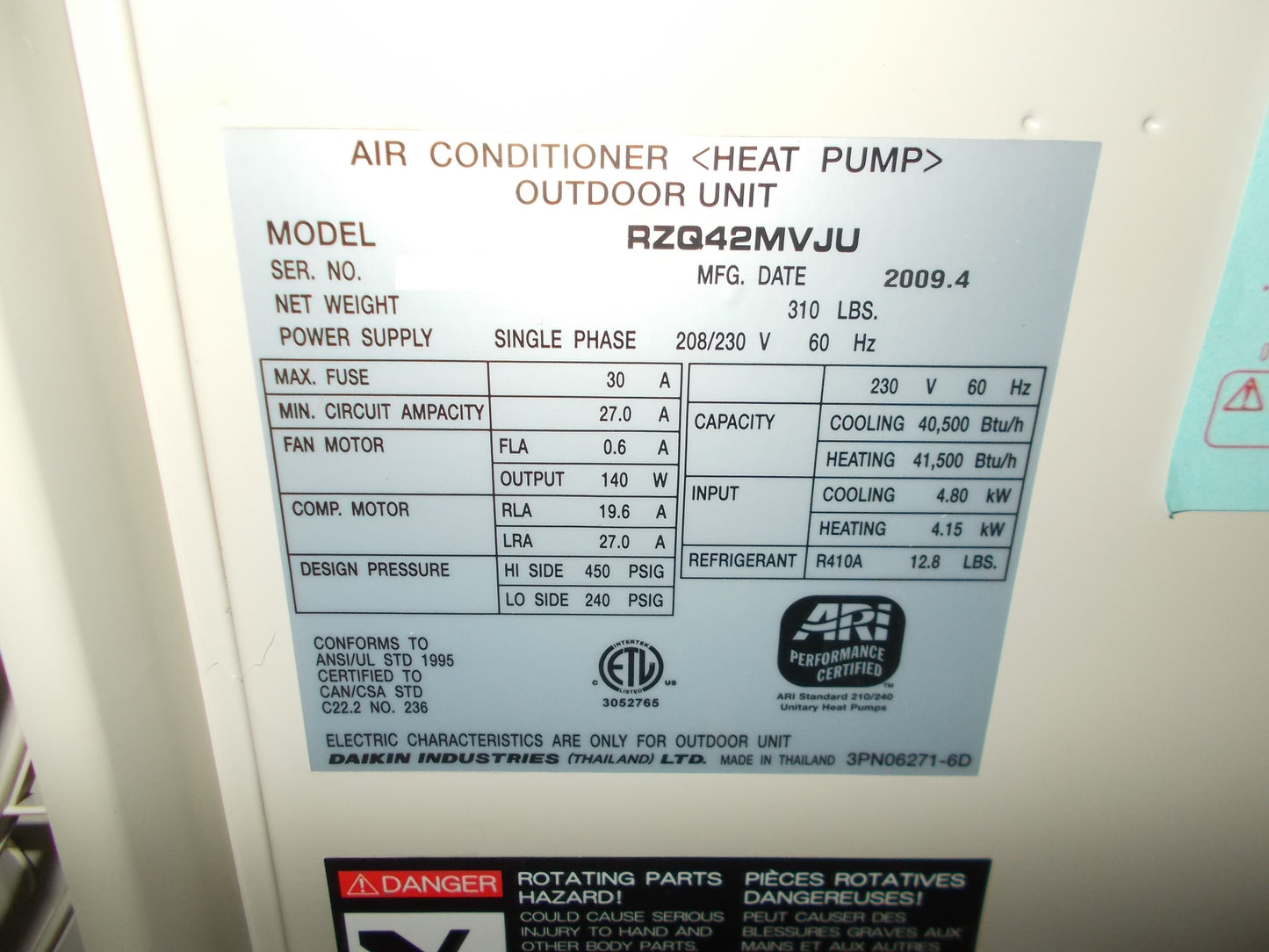 3.5 Ton Single Zone Outdoor Mini-Split Sky Air Heat Pump Unit, Volts:208-230, Hertz:60, Phase:1, SEER:13, Refrigerant:R-410A, Factory Charge:12.8 Lbs, Design Pressure High/Low:450 PSIG/240 PSIG, Metering Device:Unknown, Connections:3/8" X 5/8" Flare, Cooling BTU's:40,500, Heating BTU's:41,500, Dims:53"H X 351/4"W X 121/2"D, Weight:310 Lbs, In Mfg Box, Made In Thailand