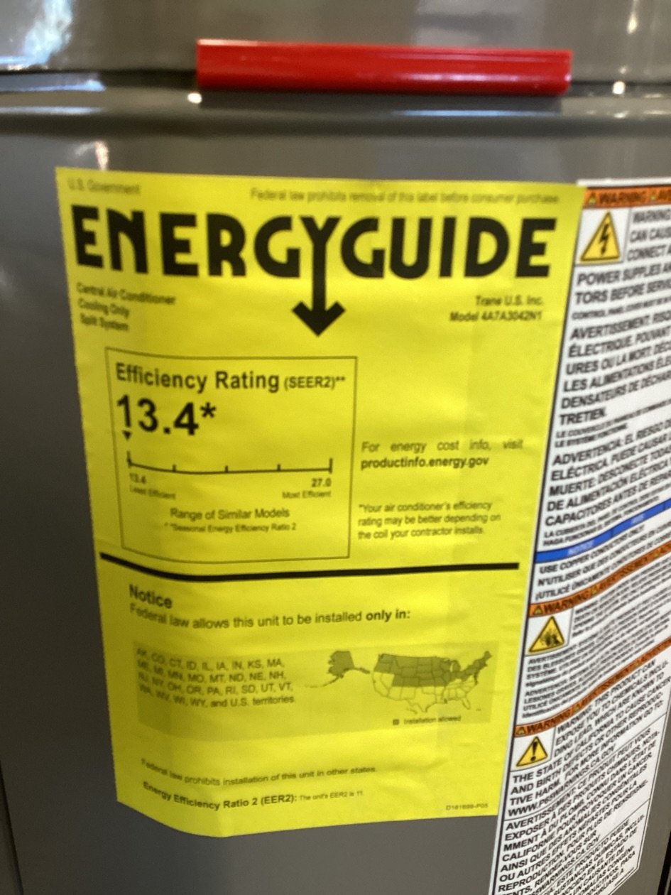 3.5 Ton Single Stage Split-System Air Conditioner, Circuit Voltage: 208-230, Hertz: 60, Phase: 1, Department of Energy Guide SEER2: 13.4, Stage: Single, Refrigerant: R410A, Connection Size: 3/8"X7/8", Connection Type: Sweat, Factory Charge: 5 lbs 5 oz, Type: Air, Dimensions: 29-1/8''H x 37-1/4''W x 34-1/4''D, Weight: 184 lbs ***Unit includes a Manufacture Warranty, register your unit with the Manufacturer for details*** **This Model Regulated For Sale/Installation In The North Region Only**