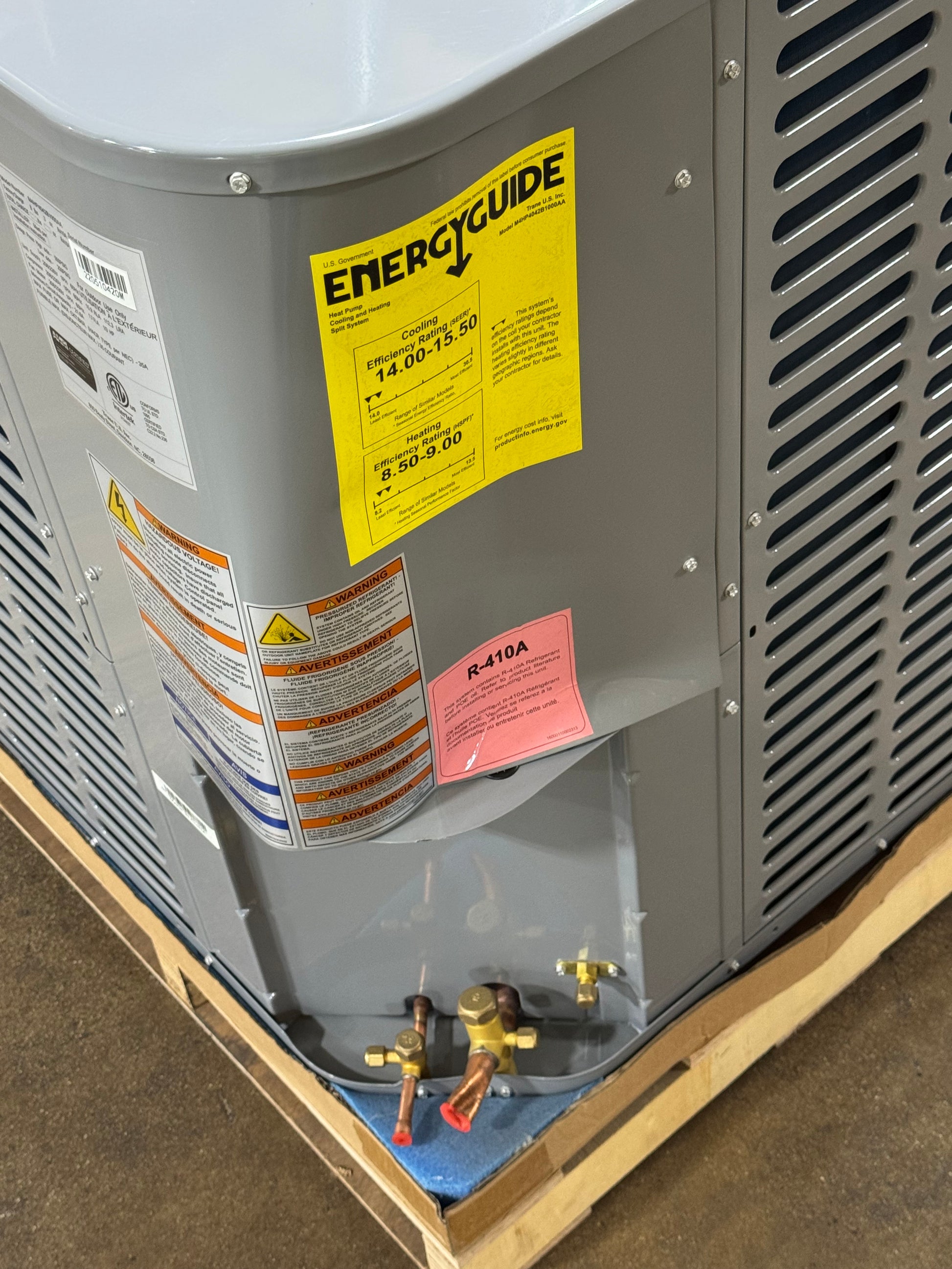 3.5 ton split system heat pump, Volts: 208-230, Hertz: 60, Phase: 1, SEER: 14, Stage: 1, Refrigerant: R-410A, Factory Charge: 8 lbs 3 oz (R-410A), Connection Size: 3/8" x 3/4", Connection Type: sweat, Type: air source, Dimensions: 33"H x 28"W x 28"D, Weight: 201 lbs, made in China **DAMAGE** MODERATE DENT ON INFORMATION PANEL AND DAMAGE TO VALVE OUTLET.