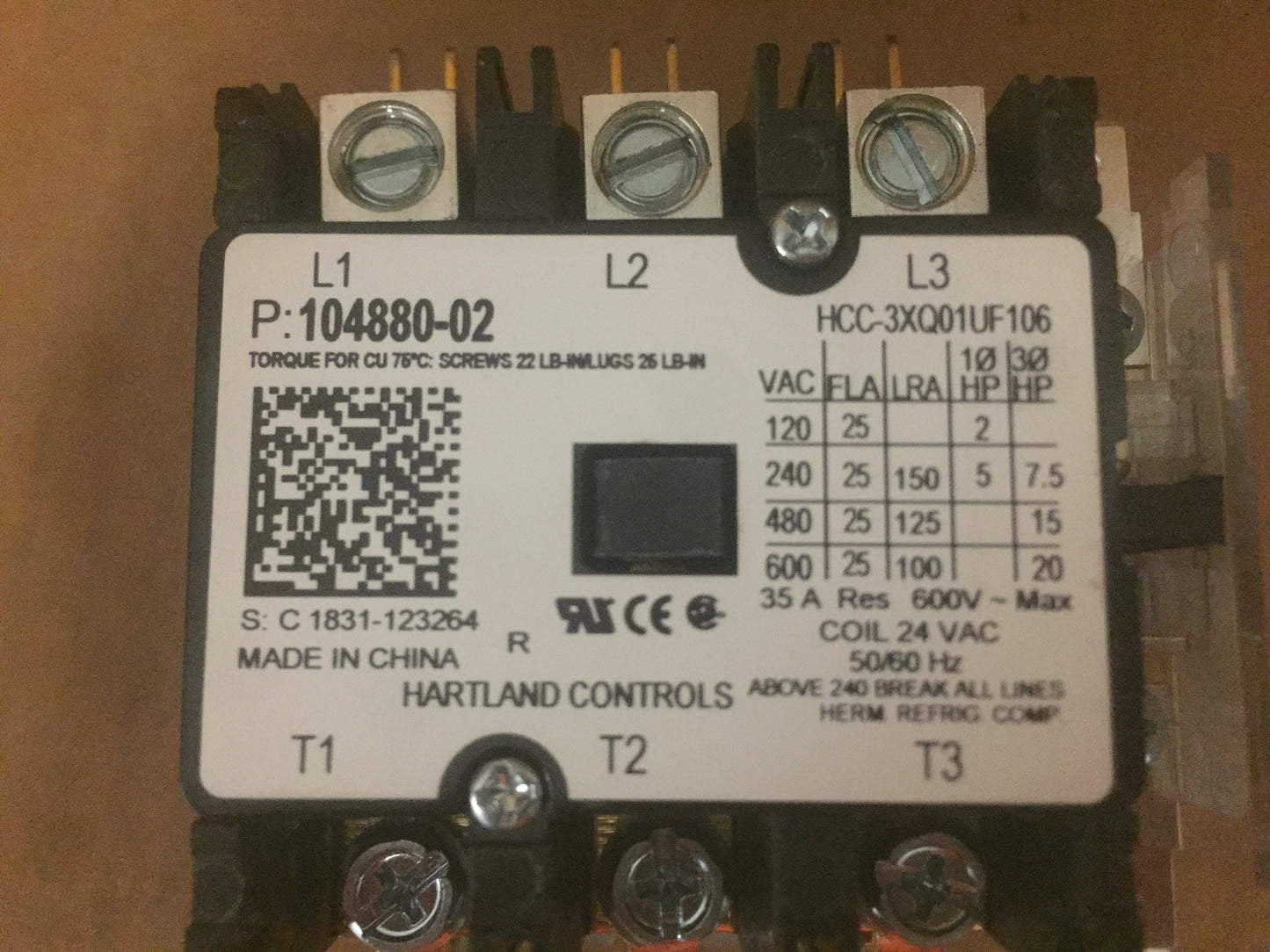 3 Pole Definite Purpose Contactor, 120-600 Volts, 24Vac Coil, 50/60 Hertz, 35 Amps, 25 Fla, 1 Phase, 3 Poles, Dims: H-3 3/4" W-3" L-3", Weight: 1.05 Lbs, Mfg. Box, Made In China