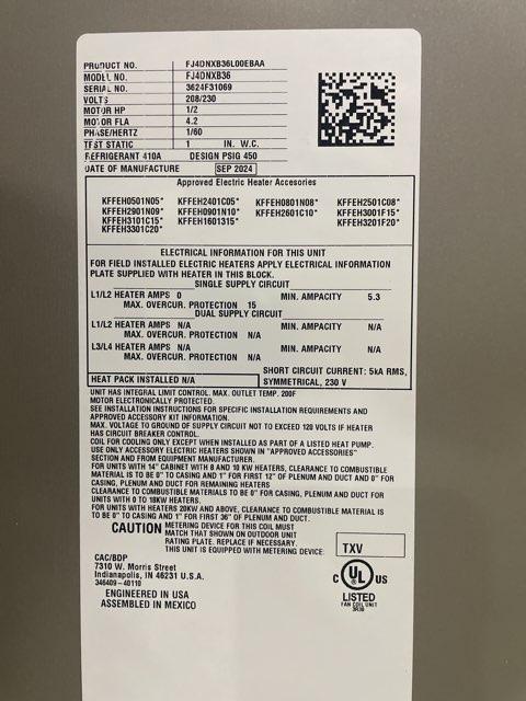 3 Ton AC/HP Fan Coil, Airflow: Multiposition, Volts: 208-230, Hertz: 60, Phase: 1, CFM: 1433, Refrigerant: R-410A, Motor Type: ECM, Metering Device: TXV, Connection Size: Suction-3/4", Liquid-3/8", Type: Air Source, Dimensions: 49-5/8''H X 17-5/8''W X 22-1/16''D, Weight: 148 lbs Paired with: