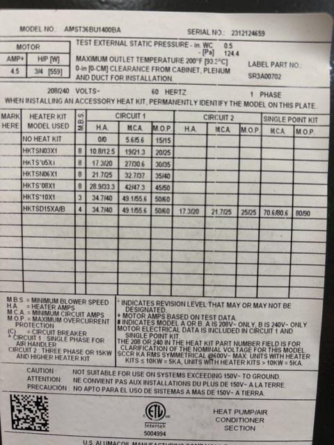 10 KW electric heat kit; Volts: 240, Hertz: 60, Phase: 1, Amps: 40, Dims: 9-1/4"H x 8"W x 11-1/4"L, in mfg. box, made in USA