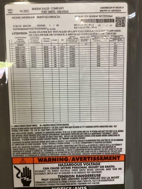 60, Phase: 1, CFM: 1200, Refrigerant: R-410A, Motor Type: ECM, Metering Device: EEV, Connection Size: Suction-3/4", Liquid-3/8", Type: Air Source, Dimensions: 50-1/2''H X 21''W X 21-11/16''D, Weight: 129 lbs ***Compatible With Econet Enabled Units*** **Compatible Heat kit: RXBH 5-15 Kw, WRX Not Included**