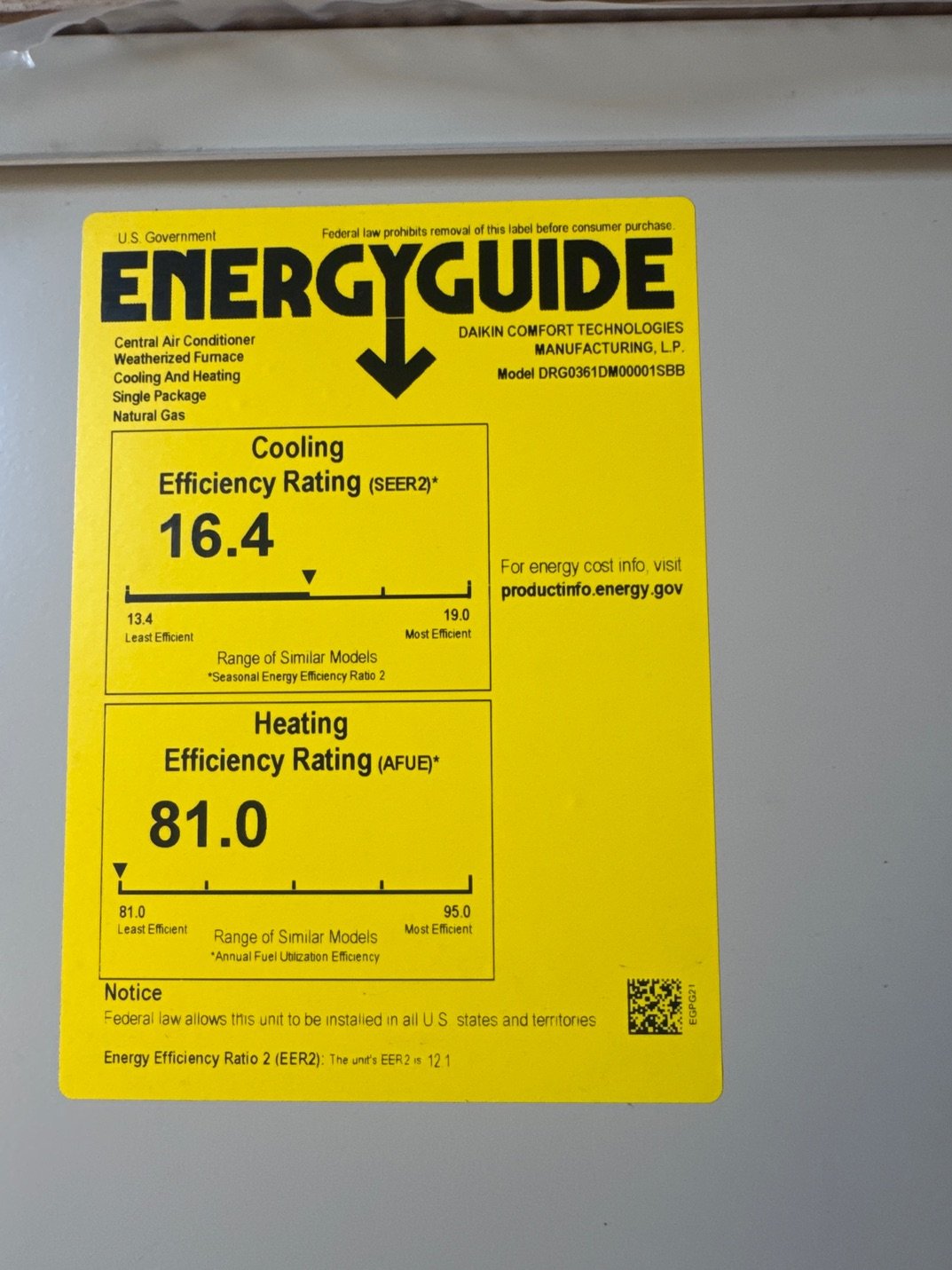 16.4, CFM: 1500, BTU Input: 70,000, BTU Output: 56,700, Cooling BTU: 36,000, Heating BTU: 70,000, Overall Dims: 39-7/8''H X 74''W X 48-5/16''D, Weight: 572 lbs ***Unit includes a Manufacture Warranty, register your unit with the Manufacturer for details***