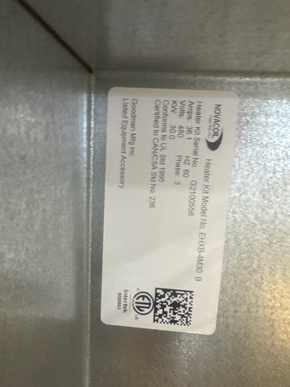 30 Kw Electric Heat Kit, Volts: 460, Hertz: 60, Phase: 3, Amps: 36.1, In Mfg Box.